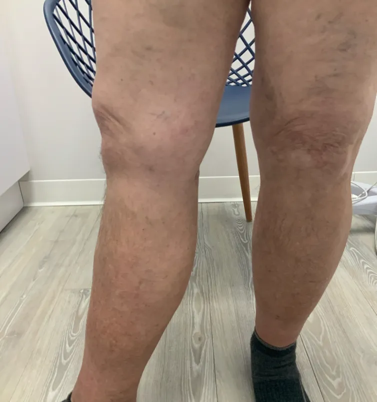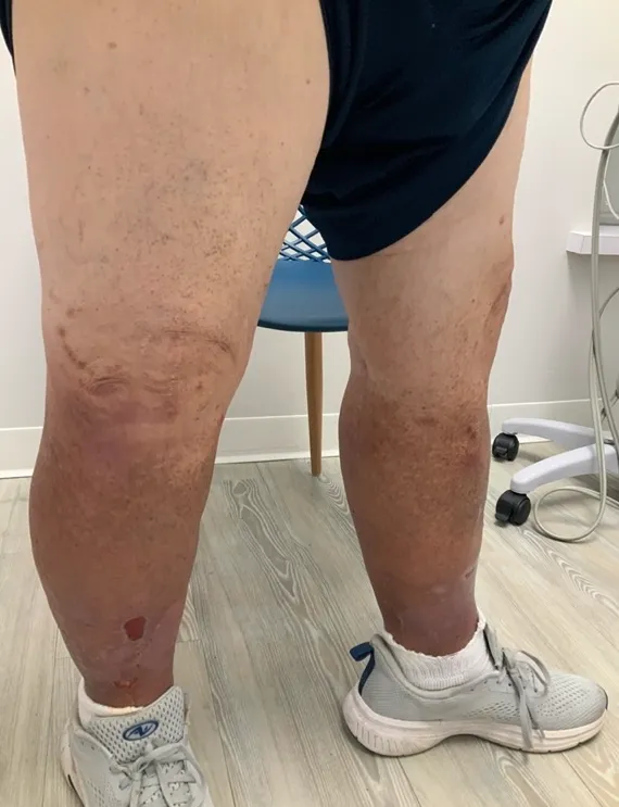 Diagnosis typically includes a physical exam and an ultrasound to evaluate underlying venous disease. Treating the root cause of poor circulation is essential to managing venous stasis dermatitis. Depending on severity, treatment may include compression therapy, topical medications to reduce inflammation, and minimally invasive vein procedures such as ablation or VenaSeal to improve blood flow and prevent progression.