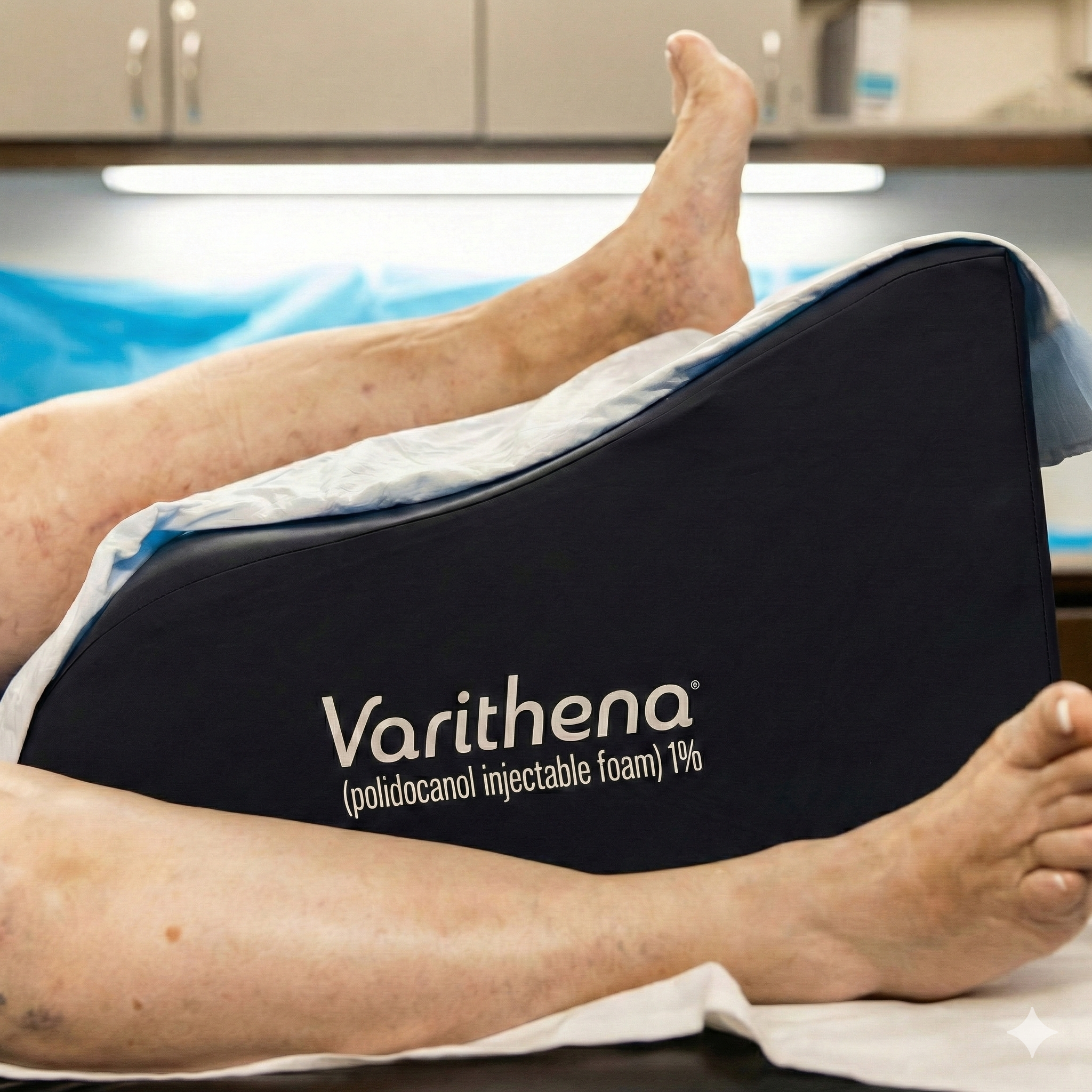 Varithena is a microfoam composed of a medical detergent called Polidocanol mixed with a specific gas mixture of oxygen and carbon dioxide. This procedure uses ultrasound guidance for precise administration of the Varithena foam into the diseased vein. The medication irritates the inner lining of the diseased vein, causing it to close. Varithena is especially beneficial and effective in treating large or tortuous varicose veins.